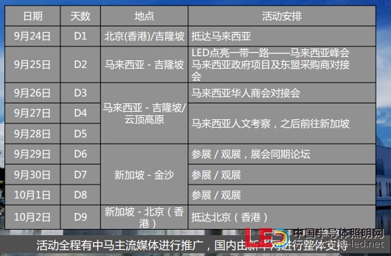 落地新加坡作為CSA點亮“一帶一路”走進東南亞活動一部分,為配合中國LED照明企業(yè)順利開辟馬來西亞市場,CSA聯(lián)盟組織了LED點亮“一帶一路”專項計劃--走進馬來西亞活動。在今年9月24日-28日,由CSA聯(lián)盟主辦的SSL Malaysia照明峰會將在馬來西亞的首都吉隆坡舉辦,除了舉辦中馬照明峰會外,還將組織一場馬來西亞商務對接會和一場馬來西亞投資論壇。