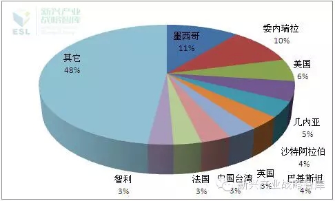 圖5:2015年上半年中國LED路燈出口前十的國家占比情況