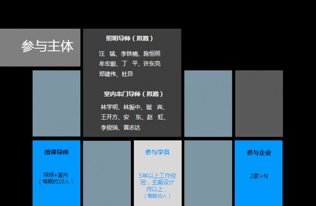 該計劃將照明行業(yè)、室內(nèi)行業(yè)充分跨界,通過業(yè)內(nèi)著名照明導(dǎo)師、室內(nèi)設(shè)計導(dǎo)師現(xiàn)場授課,通過“照明大師營”不但可以幫助設(shè)計師專業(yè)能力提升,還獲得設(shè)計大師分享實(shí)戰(zhàn)案例,照明專家分享行業(yè)解決方案,新品體驗(yàn),并可以搭建照明、室內(nèi)行業(yè)商務(wù)社交圈。