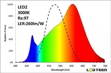 LED2則包含較多的紅光,顯指有97,光視效能(LER)也能達(dá)到260lm/W。
