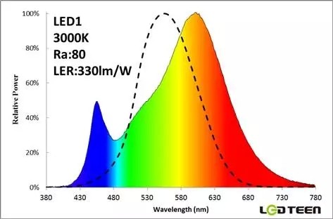 而LED1去掉了比較多的紅光,光譜里面大部分是人眼敏感的黃綠光,所以光視效能(LER)可達(dá)到330lm/W,但是因紅光去得比較多,導(dǎo)致顯指只有80。