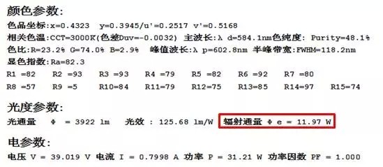 報(bào)告中用紅色標(biāo)示的輻射通量Φe就是光功率,從能量守恒的角度理解就是LED消耗了31.21W的電功率,有11.97W(占38.36%)變成了光功率,19.24W(占61.64%)轉(zhuǎn)化成熱功率,發(fā)出了3922lm的光。