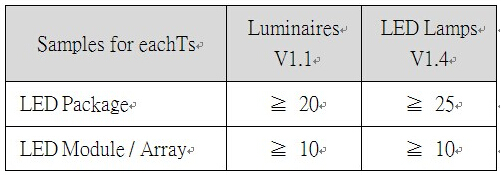 至少6,000小時(shí),建議為10,000小時(shí),每隔1,000小時(shí)需要取得測試之LED光衰資料,間隔時(shí)間越短(如:500小時(shí))可提升推估時(shí)的準(zhǔn)確度。