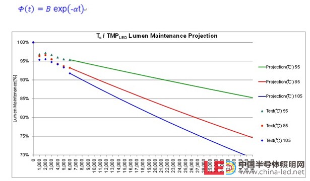 依下列公式計(jì)算出各溫度實(shí)驗(yàn)之LED在ENERGY STAR規(guī)定之流明維持率70%時(shí)的壽命時(shí)間數(shù)值。