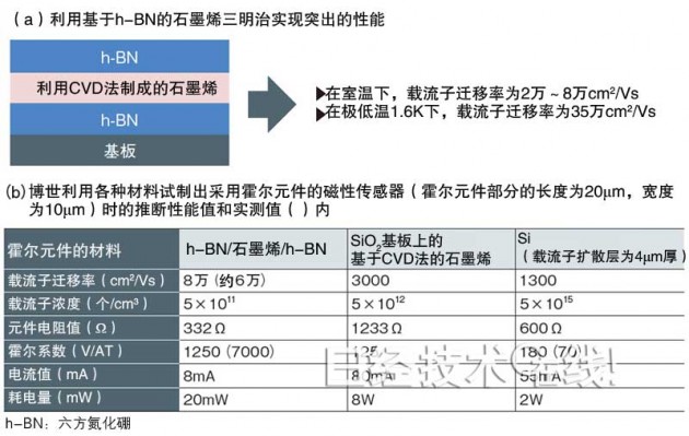 德國車載設備汽車廠商德國羅伯特博世對此非常關(guān)注。該公司還自主開發(fā)出了各種傳感器,成為其業(yè)務支柱之一。該公司利用h-BN/石墨烯/h-BN試制出了利用霍爾效應的磁傳感器,左右靈敏度的霍爾系數(shù)RH的值為7000(圖3(b))。這是霍爾元件采用Si時的100倍,也超過作為高靈敏霍爾元件材料廣為人知的InSb。并且理論上,耗電量只有Si的1/100。