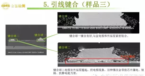 LED封裝工序會使用到不同的生產(chǎn)設(shè)備。機(jī)臺不穩(wěn)定、調(diào)機(jī)參數(shù)不好都會影響封裝工藝。金鑒檢測從微觀角度對熒光粉涂覆工藝、引線鍵合工藝和固晶工藝作全面的評估,給予廠家及時的質(zhì)量反饋。