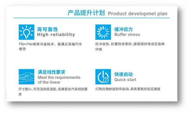 目前鴻利光電已經(jīng)推出一系列的車用LED光源,“品質(zhì)+標(biāo)準(zhǔn)+研發(fā)”并駕齊驅(qū),未來公司將重點(diǎn)把產(chǎn)品提升計(jì)劃放在①高可靠性,②滿足線性要求,③緩沖應(yīng)力,④快速啟動(dòng)等方面,保持不斷創(chuàng)新的研發(fā)步伐,追求將車用LED光源品質(zhì)做到極致,進(jìn)無止境!