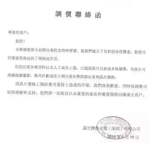 晶元寶晨相關(guān)負(fù)責(zé)人表示,此次漲價(jià)不是普遍漲,是個(gè)別產(chǎn)品個(gè)別型號(hào),由于成本核算等原因而進(jìn)行的價(jià)格調(diào)整。漲價(jià),可能會(huì)對(duì)現(xiàn)有客戶造成部份的影響,晶元寶晨也會(huì)努力應(yīng)對(duì)盡可能為客戶提供應(yīng)變方案。目前客戶反映還好,并沒(méi)有什么不利影響。