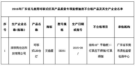 本次抽查檢驗(yàn)發(fā)現(xiàn)不合格產(chǎn)品1批次,為深圳亮仕達(dá)科技有限公司(標(biāo)稱)生產(chǎn)的“文曲星”可移式LED臺燈(型號規(guī)格:SE261;生產(chǎn)日期或批號:2015-08/),不合格項(xiàng)目為“結(jié)構(gòu)(6°平穩(wěn)度):燈具應(yīng)不傾倒/燈具傾倒”。