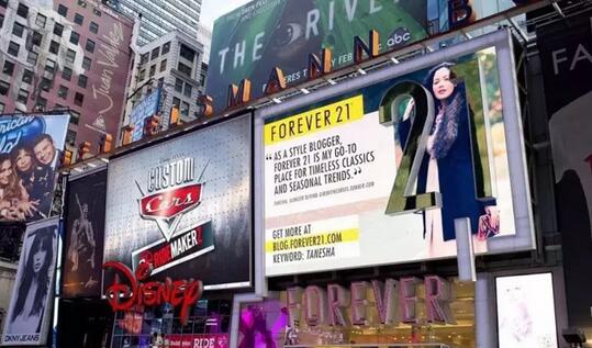 Forever 21就在廣場租了一個店面,然后建了一塊大屏,屏體除了硬件相關(guān)投入,陣地費被房租覆蓋掉,其他投入就是小頭了,這種玩法,自然比單單在廣場租塊屏的效果又要更勝一籌。