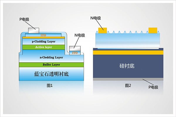 為什么說硅襯底是為垂直結(jié)構(gòu)LED而生的呢?這要從垂直結(jié)構(gòu)LED本身說起。目前中小功率芯片,大部分都是藍(lán)寶石LED芯片,P電極和N電極襯底的在同一側(cè)(圖1);而垂直結(jié)構(gòu)就是P電極和N電極在襯底的兩側(cè)(圖2)。目前藍(lán)寶石的垂直結(jié)構(gòu)LED的做法是藍(lán)寶石襯底被剝離后,在芯片底部鍍上高反射性的材料后再加上導(dǎo)電導(dǎo)熱的襯底材料的結(jié)構(gòu)。所以一旦采用藍(lán)寶石襯底,勢必需要采用激光剝離,這樣就會導(dǎo)致良率低、成本高,且剝離時(shí)的高溫對LED外延材料可能會有損傷。