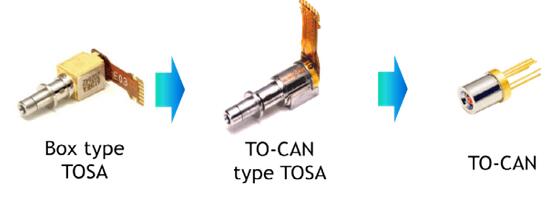 由于25Gbps DFB采用了驅(qū)動(dòng)IC非內(nèi)置的TO-CAN簡(jiǎn)單結(jié)構(gòu),實(shí)現(xiàn)了與現(xiàn)有10Gbps DFB激光器相同的外形尺寸(φ5.6mm),符合25Gbps小型收發(fā)器規(guī)格(SFP28),為新一代移動(dòng)通信系統(tǒng)的高速化作出貢獻(xiàn)。