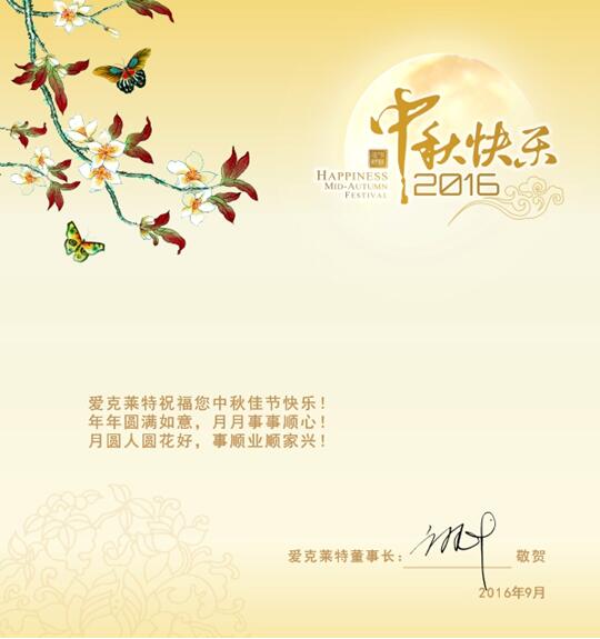 親愛的各位客戶、供應(yīng)商、員工,非常感謝您對愛克萊特的大力支持與關(guān)注,值此中秋佳節(jié)來臨之際,愛克萊特給大家送上最真摯的祝福:
