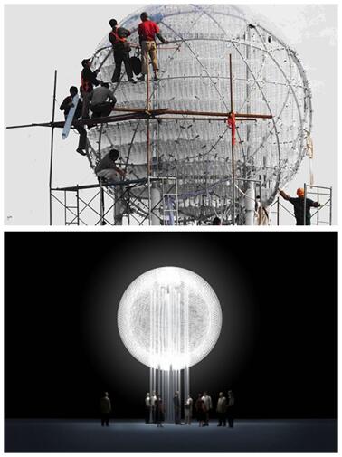 “月之魂”部分有2498個“月亮”,時間軸從建城時起到2014年,每一個“月亮”代表一個年份,通過光通信技術(shù)實現(xiàn)和手機互動,告訴你每一個月亮背后塵封的往事。每盞燈由直徑0.6米的小球組成,為了達到逼真效果,設(shè)計人員采用了半透PC材質(zhì),并在表面印刷月球圖案,用半透明半鏡面的涂刷方式來實現(xiàn)月亮斑駁的藝術(shù)效果。