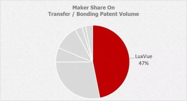 調(diào)研調(diào)查了逾10家與Micro LED技術(shù)領(lǐng)域相關(guān)的廠商,并針對其專利布局作出分析,并依據(jù)其專利內(nèi)容做分類。其中在最關(guān)鍵的轉(zhuǎn)移與鍵結(jié)(Bonding)項目上,LuxVue 擁有最多的轉(zhuǎn)移專利數(shù)量,其次為X-Celeprint。