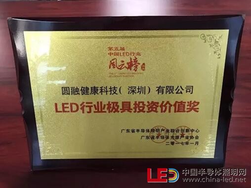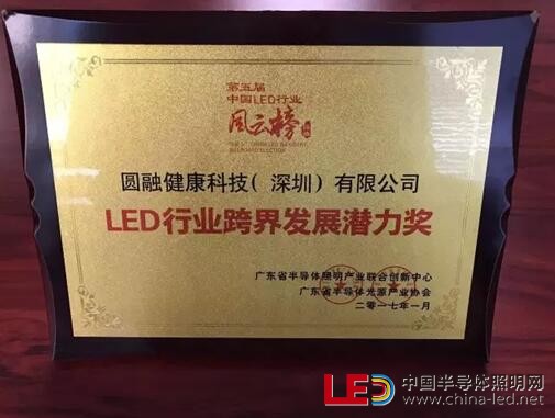 2017年1月11日,第五屆中國LED行業(yè)風(fēng)云榜頒獎典禮于江門名冠金凱悅酒店盛大開幕。本次的大會以“叩響2017·LED新發(fā)現(xiàn)”為主題,吸引了LED業(yè)界精英人士350多人赴會。整個評選活動共有200多家企業(yè)參與角逐,圓融健康科技憑借強大的軟硬件實力贏得專家評委的一致認可,最終捧得“LED行業(yè)極具投資價值獎”和“LED行業(yè)跨界發(fā)展?jié)摿Κ?rdquo;大獎。