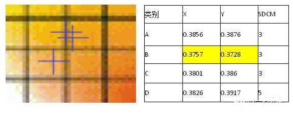 色差:顏色的差異,即兩個光色X、Y坐標值的差異大小,差值越小,色差越小。