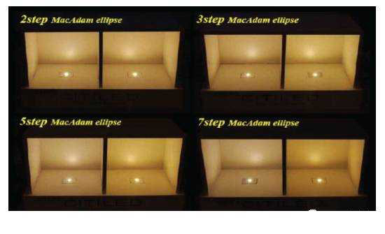 麥克亞當通過實驗證明了,恰可察覺色差與顏色匹配相對應的標準差之間成線性關系,標準差的3倍就是色差的恰可察覺差。如果兩個色坐標落在2階麥克亞當橢圓之內(nèi),則人眼幾乎是看不出兩者是有什么區(qū)別的。3階麥克亞當橢圓邊界對應的顏色與中心顏色的差別才是人眼恰可察覺的色差值,如果產(chǎn)品顏色中心點恰好是色容差中心點,那么可以用色容差來表征色差,色容差越大,色差越大。