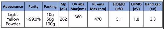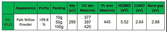 供應(yīng)蒸鍍低分子OLED的藍(lán)色發(fā)光層上的熒光主材料和熒光摻雜劑材料,產(chǎn)品色純度高、效率高、壽命長(zhǎng)。有DS-H43、DS-H45、DS-405三個(gè)系列。