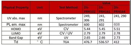 可生產(chǎn)小分子蒸鍍OLED紅色發(fā)光層上的熒光和磷光主材料、磷光摻雜劑材料,可以生產(chǎn)、供應(yīng)色純度高、效率高、壽命長(zhǎng)的新一代OLED發(fā)光材料——磷光材料。主要有DS-PRH102、DS-PRH161、DS-PRH164三個(gè)系列。