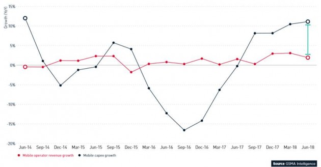再看這幅圖片,紅線代表移動(dòng)運(yùn)營(yíng)商營(yíng)收變化趨勢(shì),黑線代表移動(dòng)資本支出變化圖。