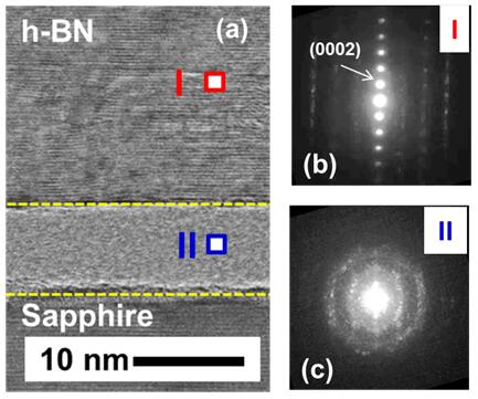 報(bào)告中介紹,A~ 60 nm厚的BN薄膜在1330°C下生長(zhǎng)于藍(lán)寶石襯底。圖1(a)展示了沿區(qū)域軸[11-20]拍攝的TEM橫截面圖像。在氮化硼外延薄膜中有兩層不同的結(jié)構(gòu)。在上一層(第I區(qū)),薄膜呈現(xiàn)出良好定向的層狀晶格和基面高度有序的堆疊序列,說(shuō)明這一層形成了h-BN。相比之下,層狀BN與藍(lán)寶石基板之間的夾層(帶II)與上層BN有顯著差異。沒有清晰有序的晶體排列和可見的層狀結(jié)構(gòu)。如圖1(b)和(c)所示,采用電子衍射圖對(duì)層間和上層BN層進(jìn)行了進(jìn)一步的研究。上面的有序?qū)釉诹呅尉Ц衽帕泻箫@示出分開的點(diǎn),表明在這一層中主導(dǎo)的是六邊形相BN,而不是渦狀或非晶態(tài)的。相反,界面夾層的衍射圖樣呈環(huán)狀,說(shuō)明非晶相在夾層中占主導(dǎo)地位。EELS分析證明,在非晶態(tài)夾層中存在Al L2、3和O K邊,而在上層h-BN薄膜中沒有發(fā)現(xiàn),說(shuō)明藍(lán)寶石可能通過(guò)提供Al和O在界面非晶態(tài)化中發(fā)揮重要作用。【根據(jù)會(huì)議資料整理,如有出入敬請(qǐng)諒解!】