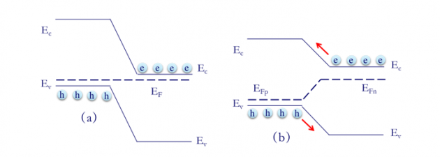 費米能級也可以是不平的。比如,LED在正向偏壓穩(wěn)定工作的“平衡態(tài)”下,其電子和空穴準費米能級存在能級差:不平的費米能級是電子和空穴運動而實現(xiàn)器件功能的驅(qū)動力。