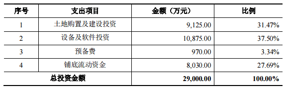 本項(xiàng)目總投資額預(yù)計(jì) 29,000.00 萬元,主要用于購(gòu)置土地、建筑工程和設(shè)備投資等,具體如下表所示: