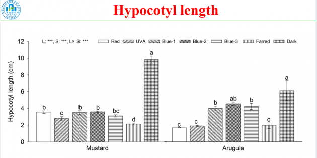 報(bào)告結(jié)合具體的研究數(shù)據(jù)與結(jié)果,指出與紅光相比,UVA和遠(yuǎn)紅光顯著抑制芥菜下胚軸的伸長。與紅光相比,所有藍(lán)光均顯著促進(jìn)了芝麻菜下胚軸的伸長。與遠(yuǎn)紅光相比,所有藍(lán)光均顯著促進(jìn)了芥菜和芝麻菜的下胚軸伸長。作為幼苗避蔭反應(yīng),深色顯著促進(jìn)了芥菜和芝麻菜的下胚軸伸長。PPFD為50mmol·m-2·s-1的單色“純”LED燈可用于控制人造光條件下微綠的伸長生長和植物形態(tài)。