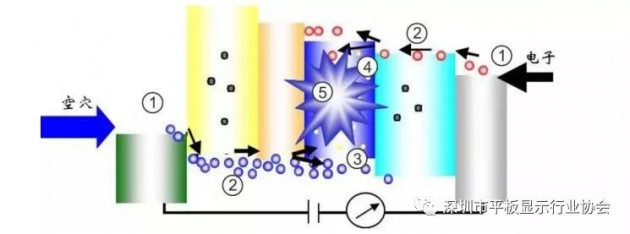 載流子注入:在外加電場作用下,電子和空穴分別從陰極和陽極向夾在電極之間的有機(jī)功能層注入。