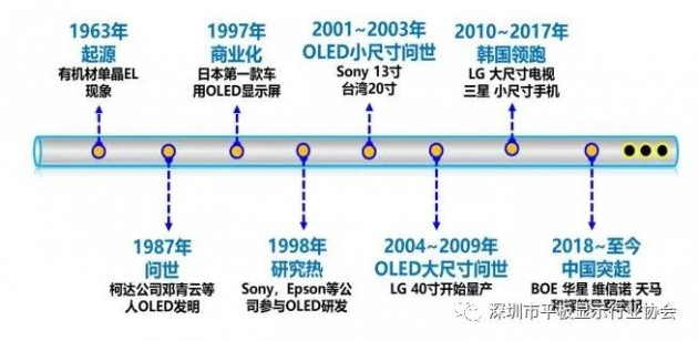 OLED的發(fā)展:OLED 技術(shù)的研究,起源于鄧青云博士(Dr.Ching Wan Tang),到了1987年,同屬柯達(dá)公司的汪根樣博士和同事 Steven 成功地使用類似半導(dǎo)體 PN結(jié)的雙層有機(jī)結(jié)構(gòu)第一次作出了低電壓、高效率的光發(fā)射器,并為柯達(dá)公司生產(chǎn) OLED顯示器奠定了基礎(chǔ)。1997年OLED由日本先鋒公司在全球第一個(gè)商業(yè)化生產(chǎn)并用于汽車音響。但是直到1999年,OLED唯一的市場僅為車載顯示器,2000年后應(yīng)用才擴(kuò)展到手機(jī)、PDA(包括電子詞典、手持電腦和個(gè)人通訊設(shè)備等)、相機(jī)、手持游戲機(jī)、檢測儀器等。2009年各大廠商開始將重心轉(zhuǎn)向AMOLED,致使AMOLED產(chǎn)值首度超越PMOLED。2013年LGD,SMD先后推出55英寸OLED電視。2017年蘋果十周年紀(jì)念手機(jī)iPhoneX采用AMOLED屏幕。所以O(shè)LED從首次商業(yè)應(yīng)用到成功推出55英寸電視屏僅僅用了16年時(shí)間,而LCD走過這段歷程則花了32年時(shí)間,可見全球OLED產(chǎn)業(yè)發(fā)展非常迅猛。