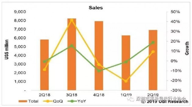 如下圖所示,OLED的營收在2019年Q2已經(jīng)達(dá)到 69億美元,比2019 Q1增長了9.5%,比去年同期增長了18.9%。三星和LG分別位列第一和第二位,而中國的BOE以6%的市場份額占比位列第三位。