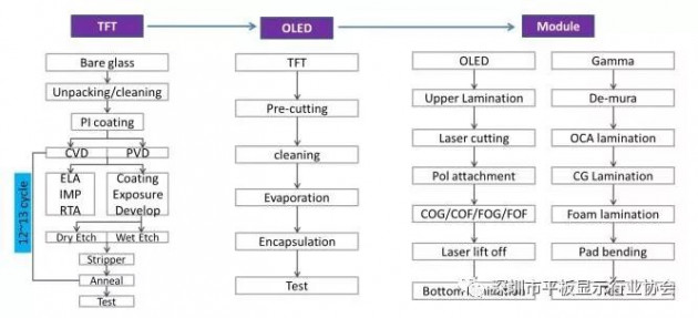 OLED制作工藝囊括了顯示面板行業(yè)的諸多尖端技術(shù),其主要分為背板段(array)、前板段(OLED成盒)以及模組段三道工藝。背板段工藝通過成膜、曝光、蝕刻、顯影疊加不同圖形不同材質(zhì)的膜材以形成LTPS驅(qū)動電路,其為發(fā)光器件提供點(diǎn)亮信號以及穩(wěn)定的電源輸入。該部分工藝的主要技術(shù)難點(diǎn)在于微米級的工藝精度以及對于電性指標(biāo)的極高均一度要求。其細(xì)節(jié)流程如下: