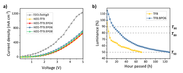 圖6.(a)單電子和單空穴器件,(b)器件壽命測試結(jié)果。