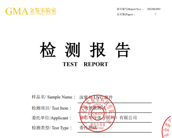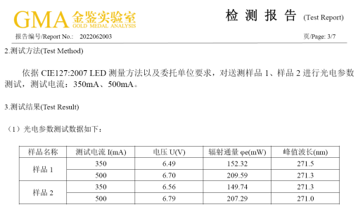 該大功率紫外器件,經(jīng)權(quán)威第三方檢測機構(gòu)檢測,在注入電流500mA的條件下,峰值波長271nm,輸出光功率達(dá)到209.59mW,使得UVC紫外芯片在殺菌效率方面達(dá)到新的高度。(參考附件)