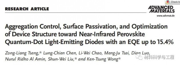 在這項工作中,來自中國臺灣的研究人員通過用2-苯基乙基碘化銨(PEAI)對長烷基封裝的量子點進行后處理,開發(fā)了新的近紅外發(fā)射FAPbI3量子點。PEAI的加入減少了量子點的表面缺陷,使光致發(fā)光量子產(chǎn)率高達61.6%。結(jié)合有效的電子傳輸材料CN-T2T,實現(xiàn)了高達15.4%的外部量子效率,這是有史以來鈣鈦礦基NIR QLED的最高效率。本研究為制備適合高效近紅外QLED應(yīng)用的高質(zhì)量鈣鈦礦量子點薄膜提供了一種簡便的策略。相關(guān)論文以題目為“Aggregation Control, Surface Passivation, and Optimization of Device Structure toward Near-Infrared Perovskite Quantum-Dot Light-Emitting Diodes with an EQE up to 15.4%”發(fā)表在Adv. Mater.期刊上。