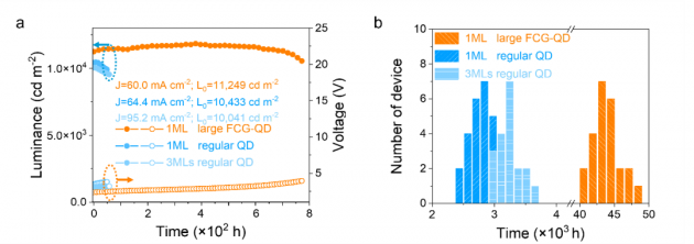 本研究在低驅(qū)動電壓下獲得了高亮度器件發(fā)光,同時獲得了超高的功率轉(zhuǎn)換效率、顯著降低了器件發(fā)熱,使器件的穩(wěn)定性得到了極大改善。圖3展示了QLED器件在1000 cd/m2下亮度降低到95%(T95)壽命達到了48,000 h。