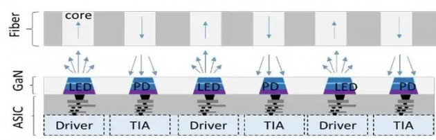 LED陣列使用InGaN / GaN微型發(fā)光二極管,可以實(shí)現(xiàn)大規(guī)模并行傳輸,從而達(dá)到高數(shù)據(jù)速率密度。