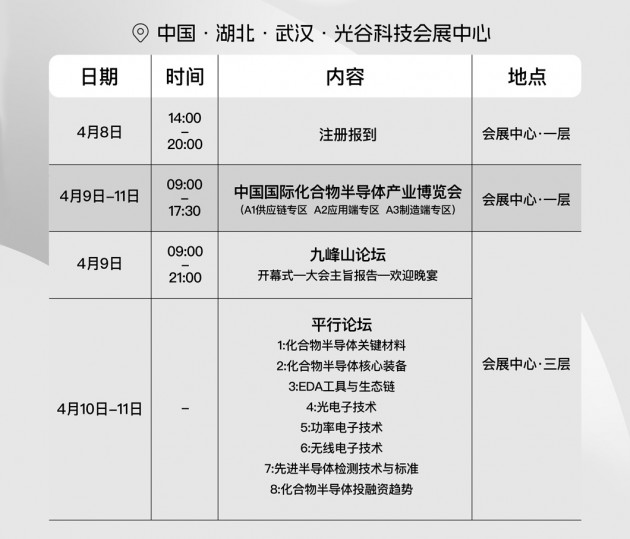 當(dāng)前化合物半導(dǎo)體產(chǎn)業(yè)發(fā)展持續(xù)升級(jí),為共建化合物半導(dǎo)體創(chuàng)新生態(tài),4月9-11日,由第三代半導(dǎo)體產(chǎn)業(yè)技術(shù)創(chuàng)新戰(zhàn)略聯(lián)盟(CASA)、九峰山實(shí)驗(yàn)室共同主辦的“2024九峰山論壇暨中國(guó)國(guó)際化合物半導(dǎo)體產(chǎn)業(yè)博覽會(huì)(簡(jiǎn)稱(chēng)“JFSC&CSE”)將在武漢光谷科技會(huì)展中心舉辦。