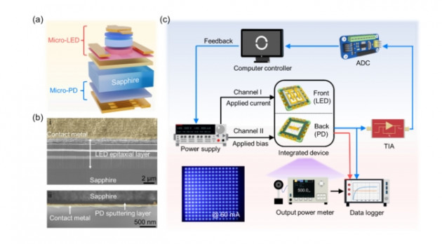 (a)深紫外micro-LED與光電探測(cè)器(PD)三維垂直集成芯片架構(gòu)。(b)深紫外LED外延層與薄膜光電探測(cè)器截面的掃描電子顯微鏡圖像。(c)基于雙面垂直集成器件搭建的具有自校準(zhǔn)、自監(jiān)測(cè)功能的穩(wěn)定發(fā)光系統(tǒng)示意圖