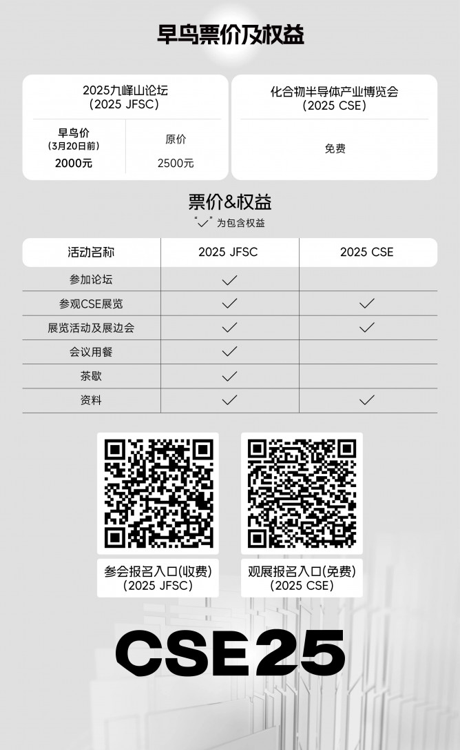 2025九峰山論壇暨化合物半導(dǎo)體產(chǎn)業(yè)博覽會(huì)(CSE)將于4月23-25日在武漢中國(guó)光谷科技會(huì)展中心隆重舉行。本屆展會(huì)共設(shè)半導(dǎo)體設(shè)備、半導(dǎo)體材料及原輔料、終端應(yīng)用、加工制造、前沿技術(shù)與創(chuàng)新成果6大展區(qū),完整呈現(xiàn)化合物半導(dǎo)體產(chǎn)業(yè)鏈的創(chuàng)新圖譜。目前展會(huì)已匯聚10國(guó)200+頂尖企業(yè),覆蓋設(shè)備、材料、設(shè)計(jì)、制造及終端應(yīng)用全產(chǎn)業(yè)鏈。展會(huì)同期舉辦九峰山論壇11大平行論壇,15+同期活動(dòng),將為參會(huì)者提供全方位、多層次的交流體驗(yàn),助您開拓市場(chǎng)、贏取商機(jī)!