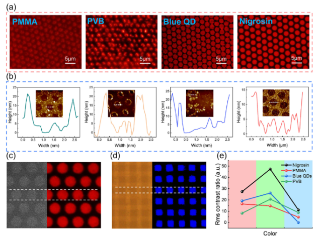 圖 3 a, 使用不同表面微結構材料組裝的量子點陣列的光學照片。 b, 使用不同表面微結構材料獲得微結構形的原子力顯微鏡圖像和高度分布。c、量子點組裝前黑色素構建的孔狀圖案的SEM圖像和量子點組裝后圓形圖案的熒光顯微照片。 d、量子點在黑色素微結構表面組裝前后的熒光顯微照片。e,用不同材料構建的表面微結構組裝的量子點圖案的對比度。